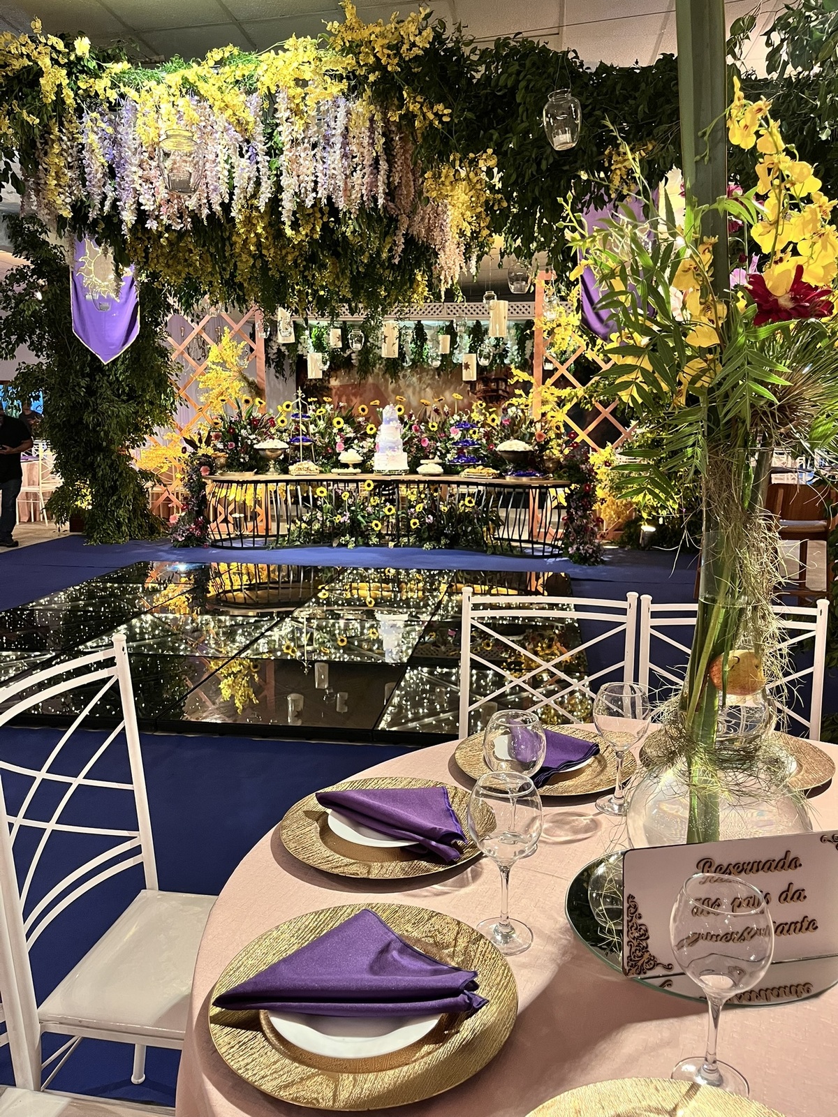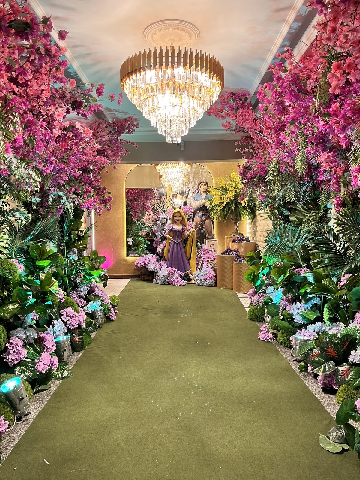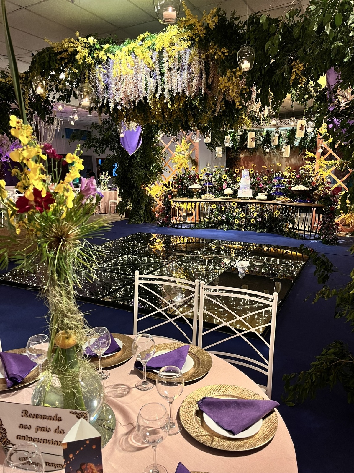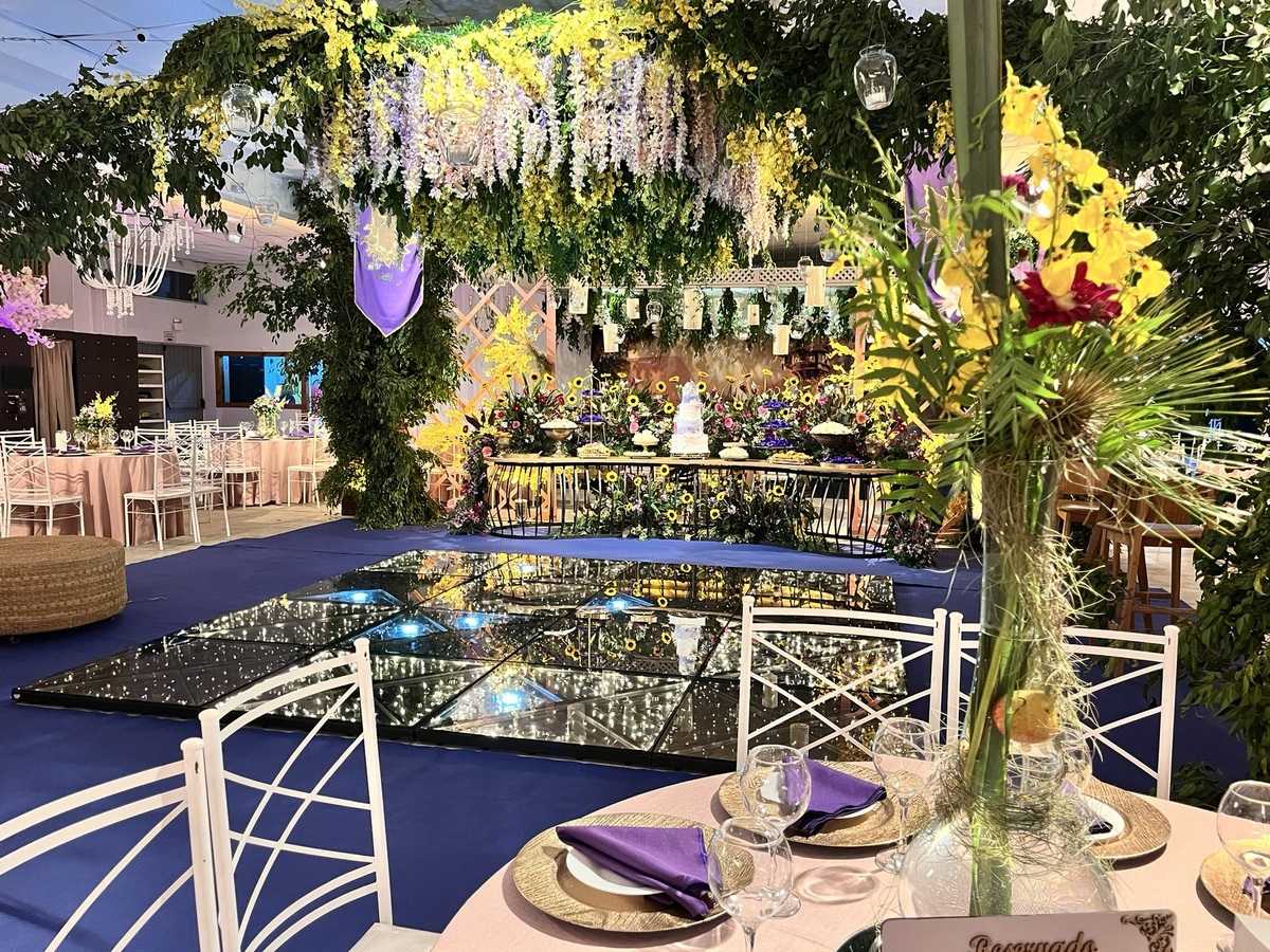 Cada detalhe dessa festa de 15 anos foi pensado para encantar: flores abundantes, cores vibrantes, luzes suaves e um caminho que conduzia direto para a magia do tema.