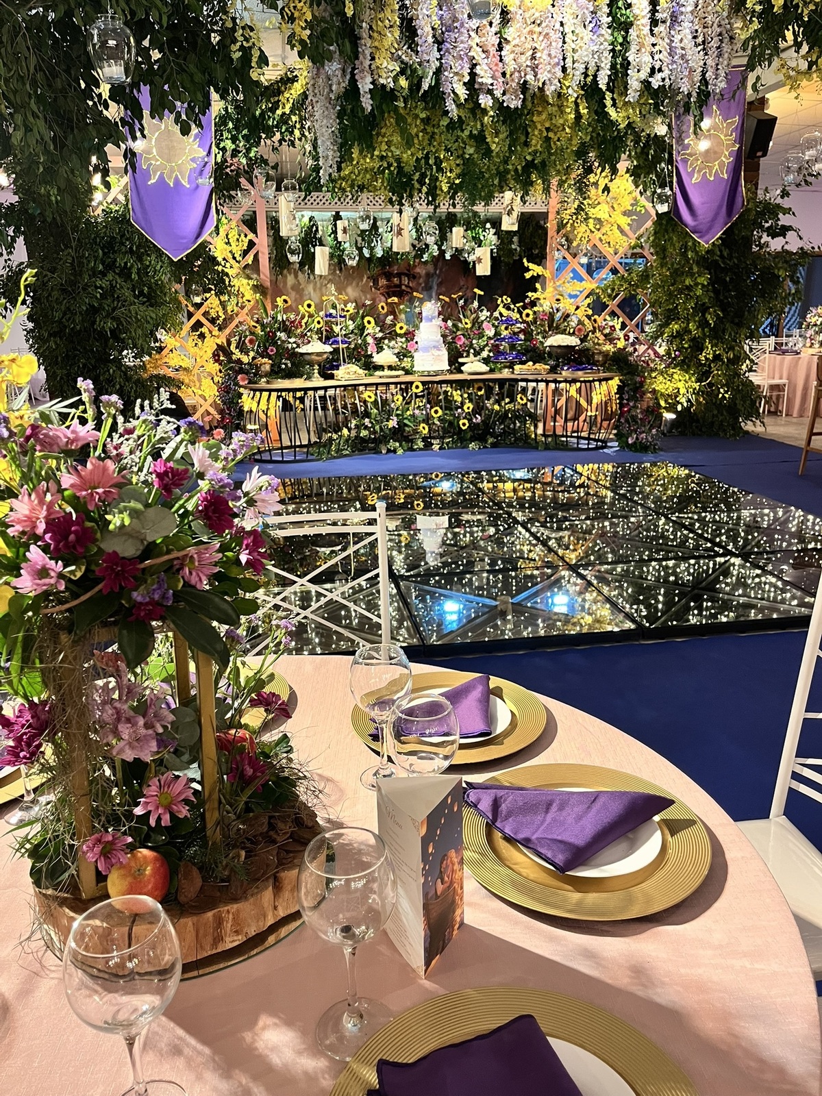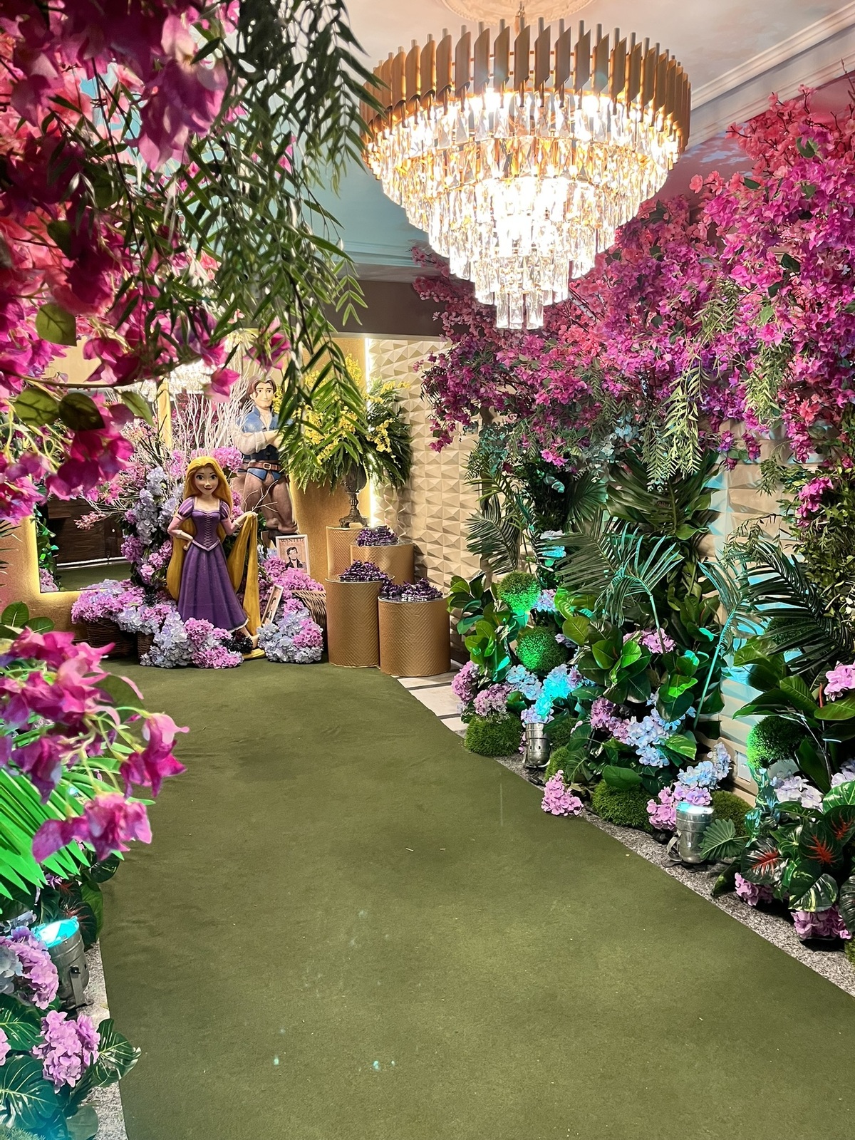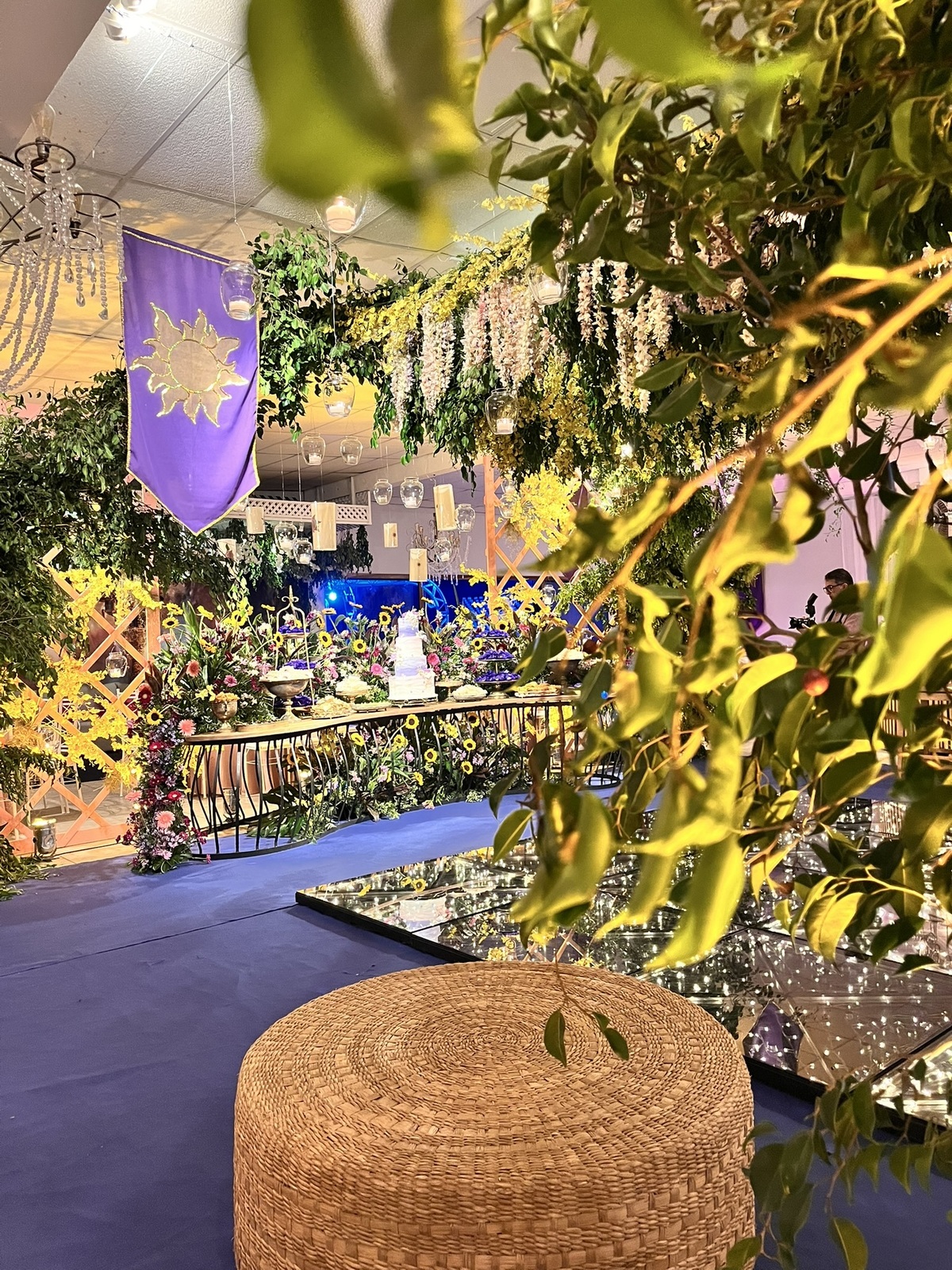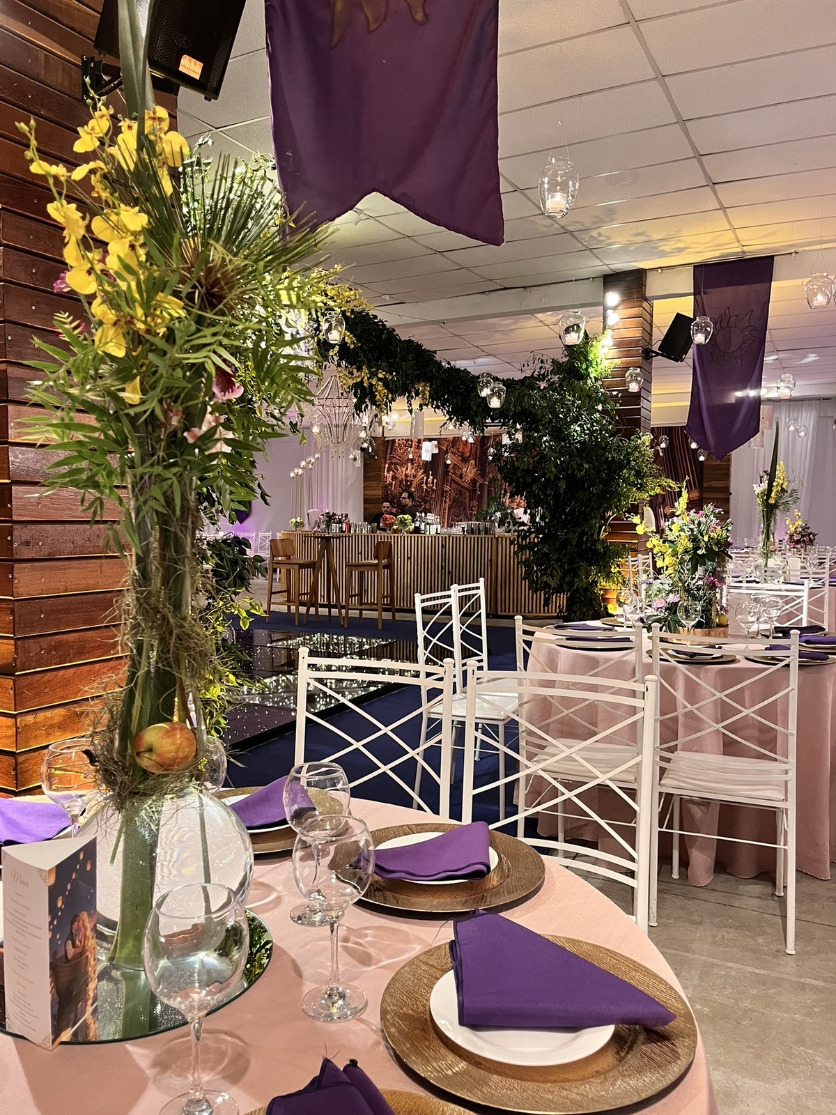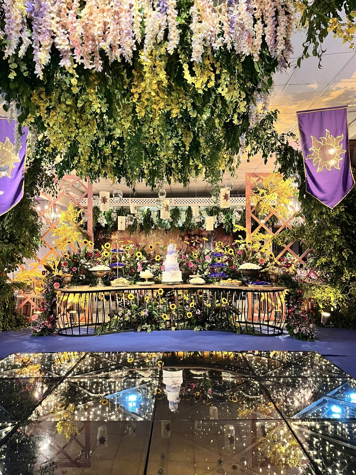 Cada detalhe dessa festa de 15 anos foi pensado para encantar: flores abundantes, cores vibrantes, luzes suaves e um caminho que conduzia direto para a magia do tema.