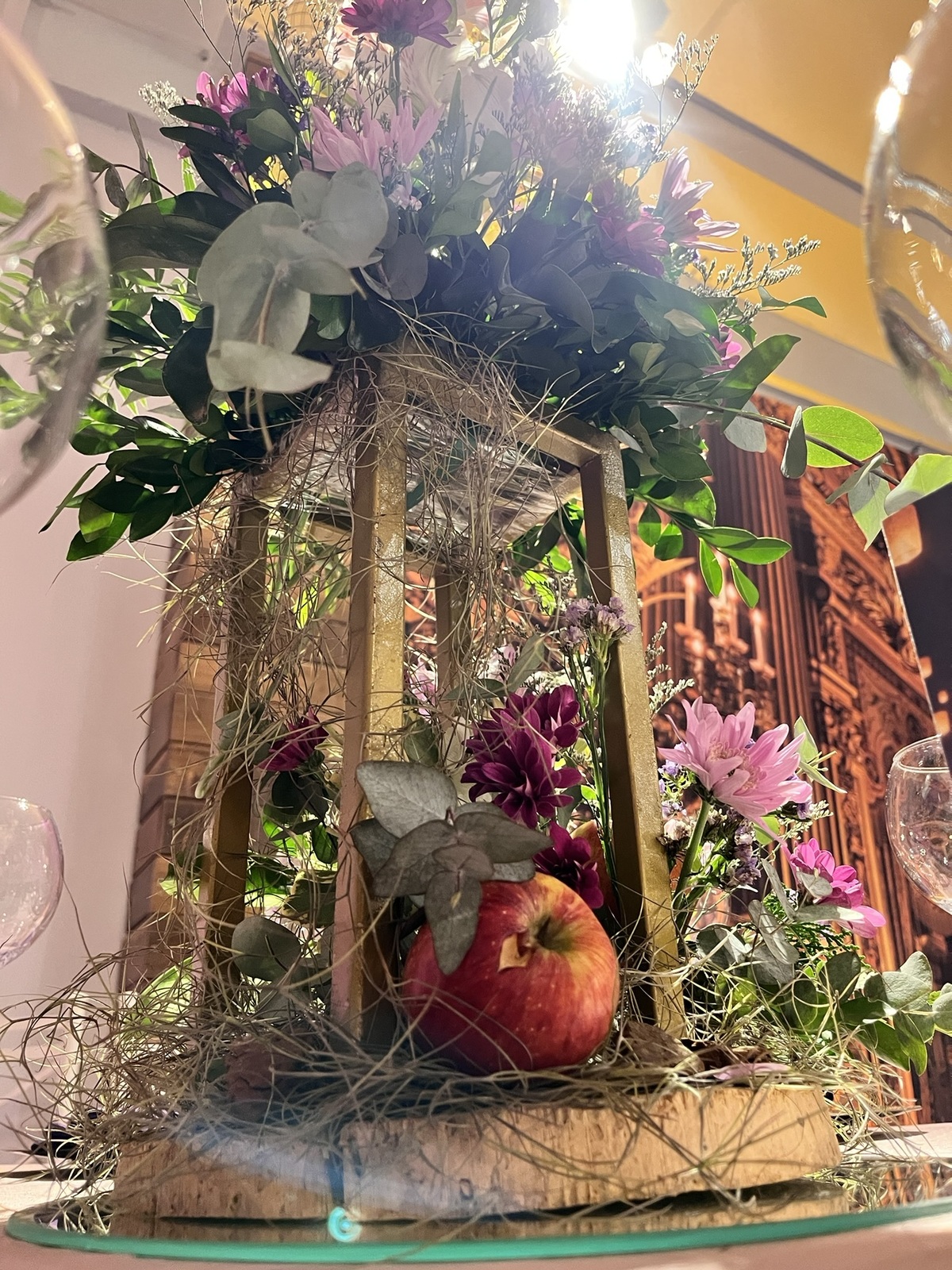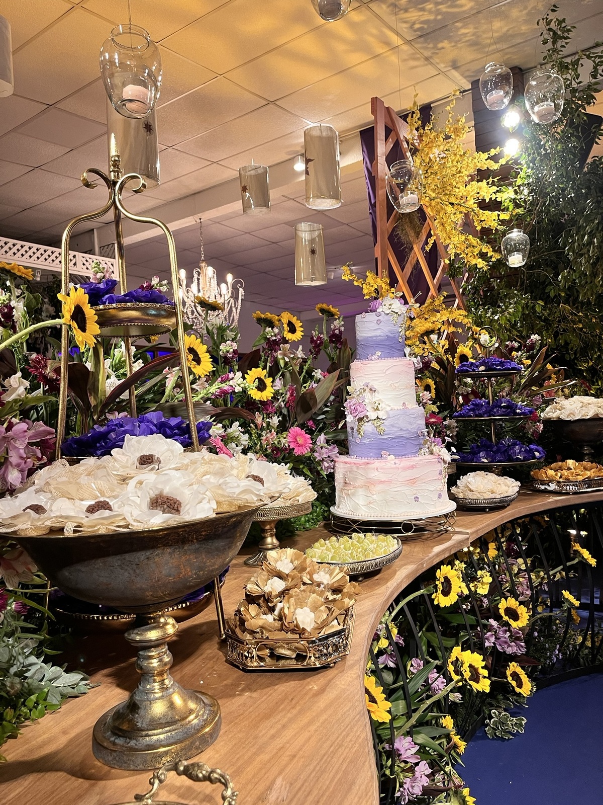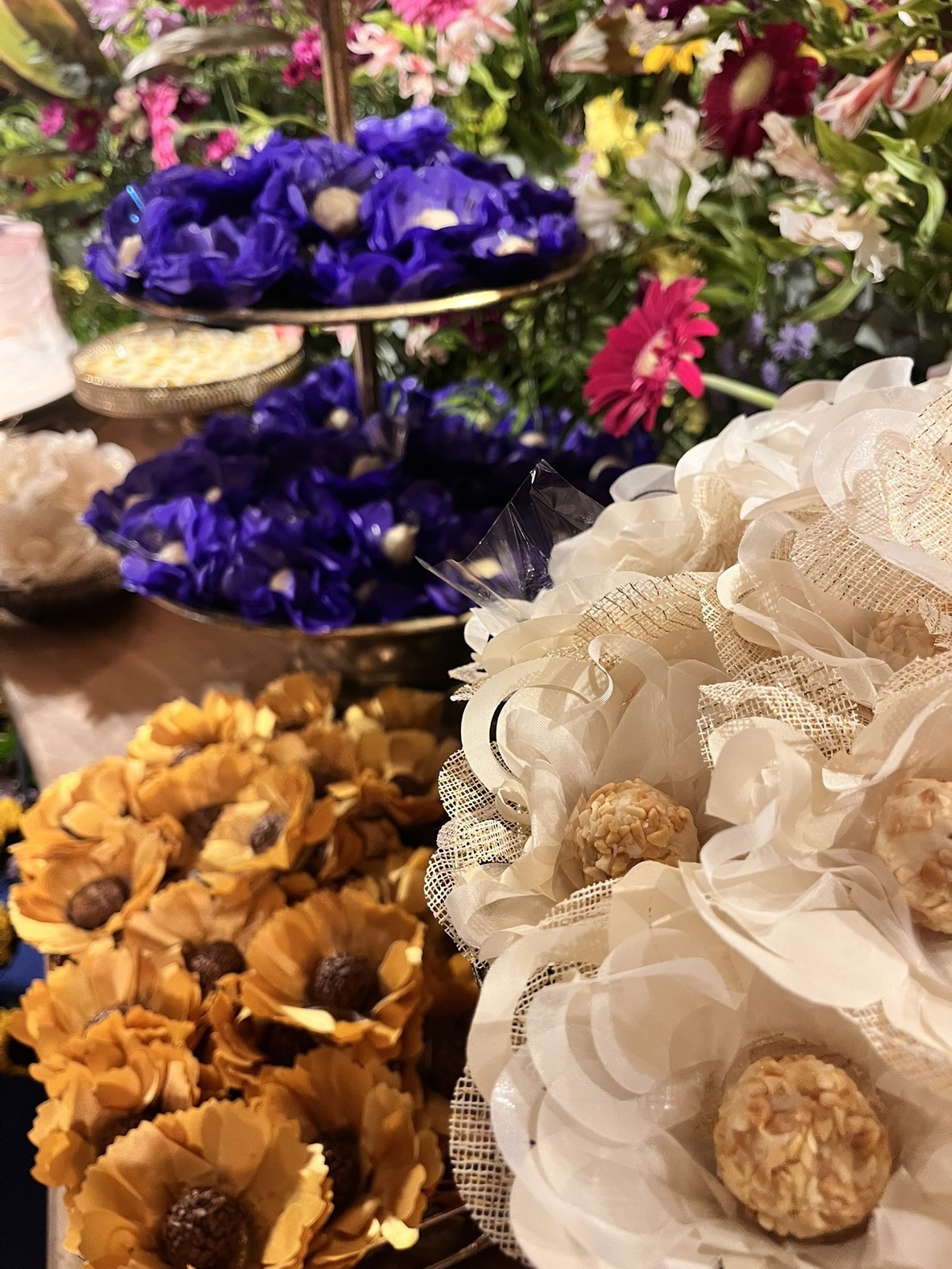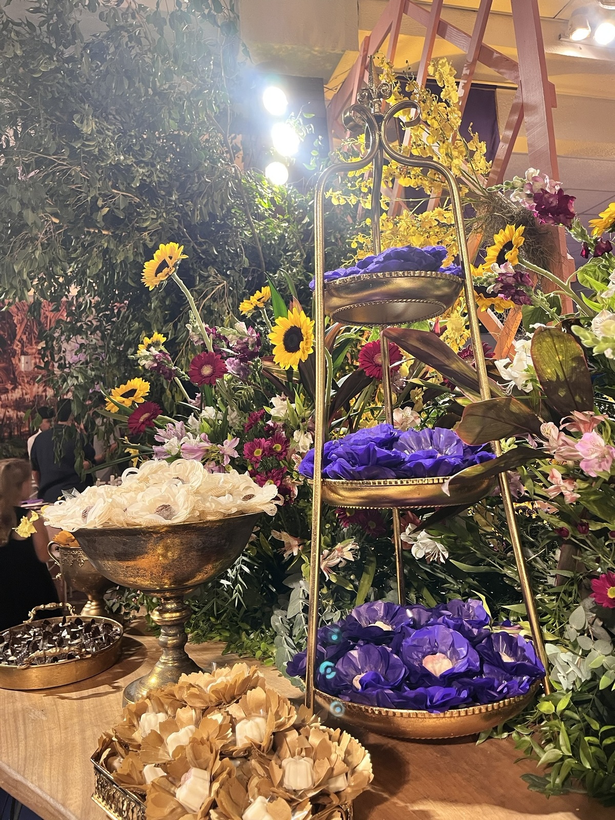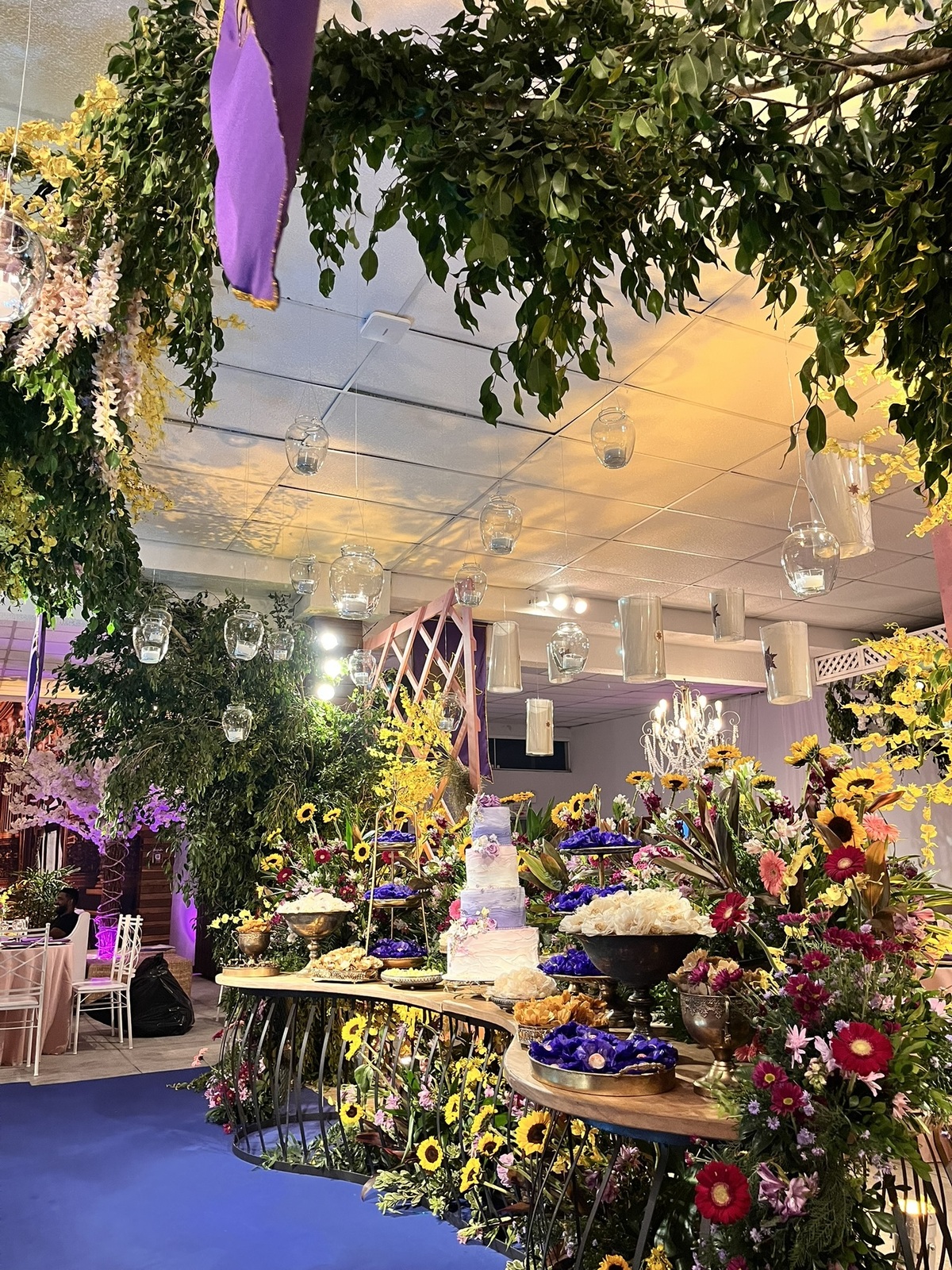 A decoração envolvia, surpreendia e convidava a olhar com calma — dos centros de mesa aos elementos suspensos, tudo conversando entre si!
